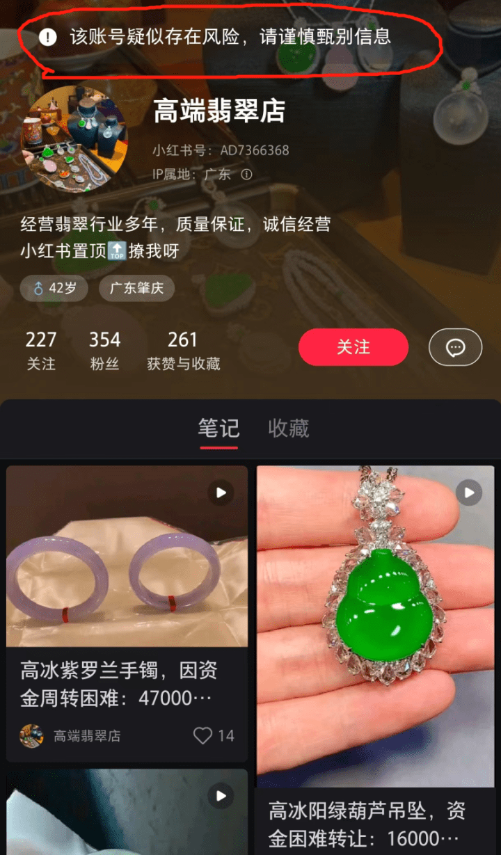 按照于正曝光的账号“中缅高端翡翠”,潮新闻记者查询小红书平台发现,该账号IP属地为广东肇庆,当前账号已经改成“高端翡翠店”,并被平台提示“该账号疑似存在风险,请谨慎甄别信息”。