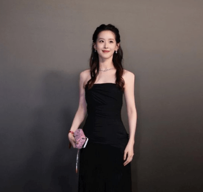 照片中,章泽天扎着公主头,身穿黑色抹胸礼服,手拿粉色小包,一身造型华丽时尚,知性优雅显气质。
