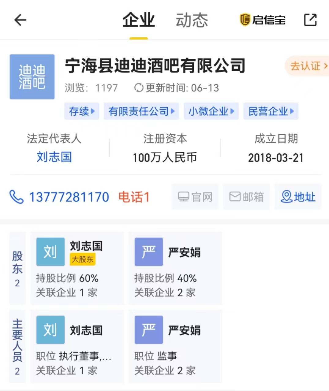 启信宝app显示,宁海县迪迪酒吧有限公司成立于2018年3月21日,注册资本100万元人民币。