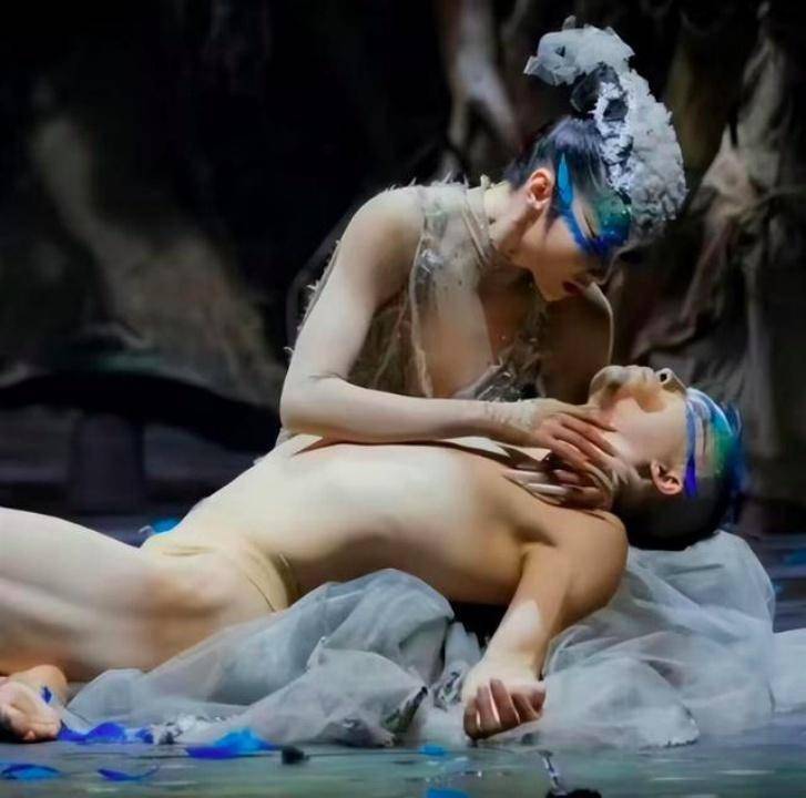 照片中的男舞者全身只穿着一条肉色紧身打底裤,侧躺在女舞者怀里的时候,舞台光打上去,看起来就像全身赤裸。