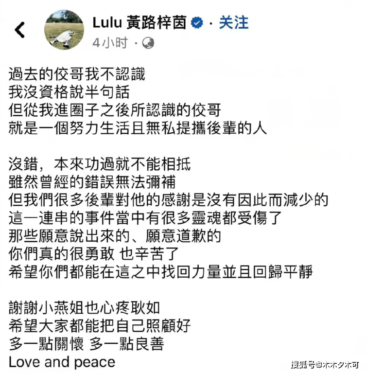 妻子孟耿如回应媒体称会跟丈夫一起面对问题,弥补损失,不得不说黄子佼娶了一位好妻子,而黄子佼的爱徒lulu也发文表示,虽然师父曾经的过错无法弥补,但我们后辈对他的感谢并没有因此而减少,言外之意就是他们不在乎黄子佼的过去,而是看到了黄子佼当下,是一个努力生活且无私提拔后辈的人,希望大家多一点关怀,多一点善良,这个发言也很难评。