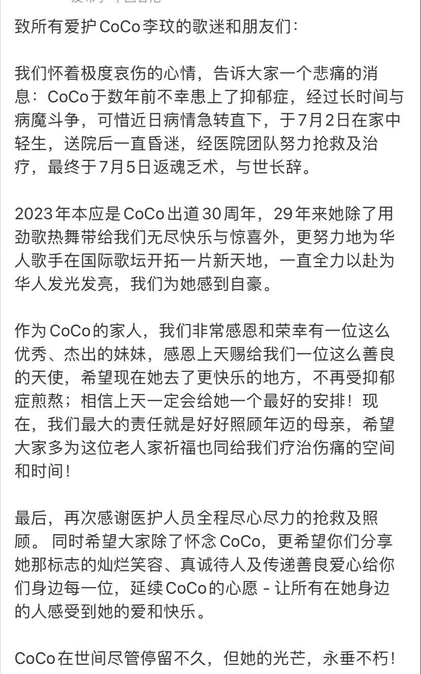 2023年7月5日晚上,本来是个很寻常的夜晚,但是李玟的姐姐突然发文宣布,妹妹李玟因为病痛困扰庆生,遗憾离世。