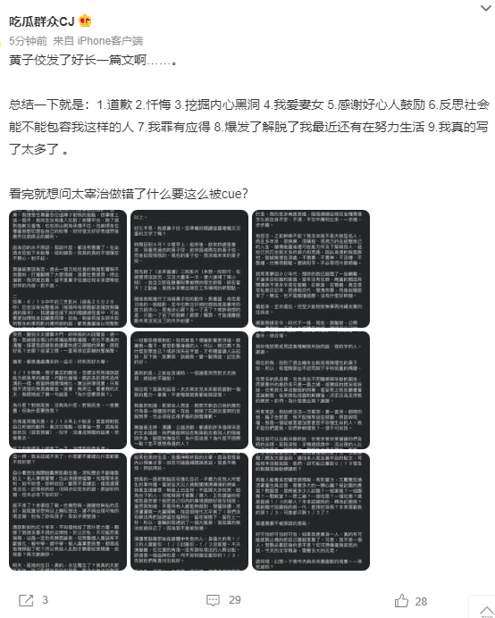 黄子佼表示,这篇文章光整理就花了25个小时,用了1个月时间去构思,不过很多话和内容都存在重复,下面只讨论重要的点。黄子佼回应为什么要在6月19日发布三段视频爆料,称当时最直接的念头是“反正,下午之后,我不在了,大可什么都不在乎了,什么面子、里子都不要了!做个交代抱怨我的灵魂才能放下吧?”