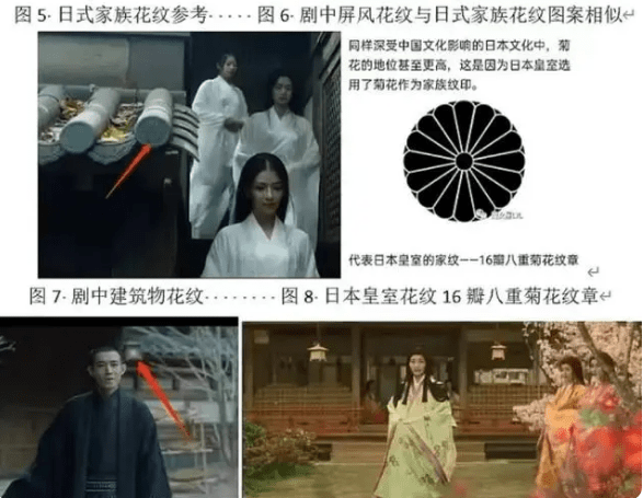 这还不是最严重的,有网友发现,剧中居然还出现了日国徽。在建筑物上,出现了16瓣八重菊的图案,有知情人称,这是日本的国徽,在日本很有代表性的图案。不过,也有网友称,这是日本大家族的图腾,无论是哪一种,都是很有日风格的。