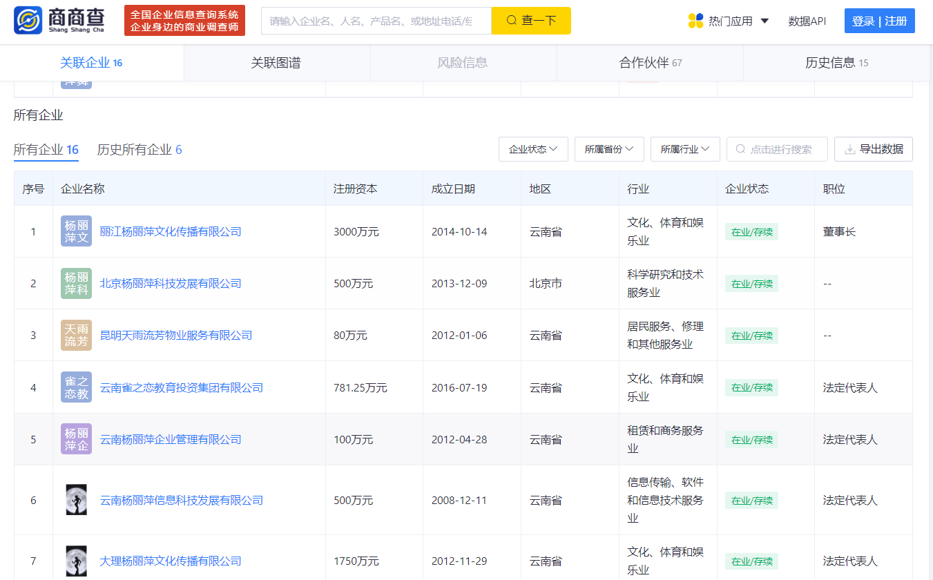 【商商查】显示,杨丽萍为第十届中国舞蹈家协会副主席、国家一级演员,其关联16家企业,其中12家在业,涉及文化娱乐、科学研究、信息技术等。