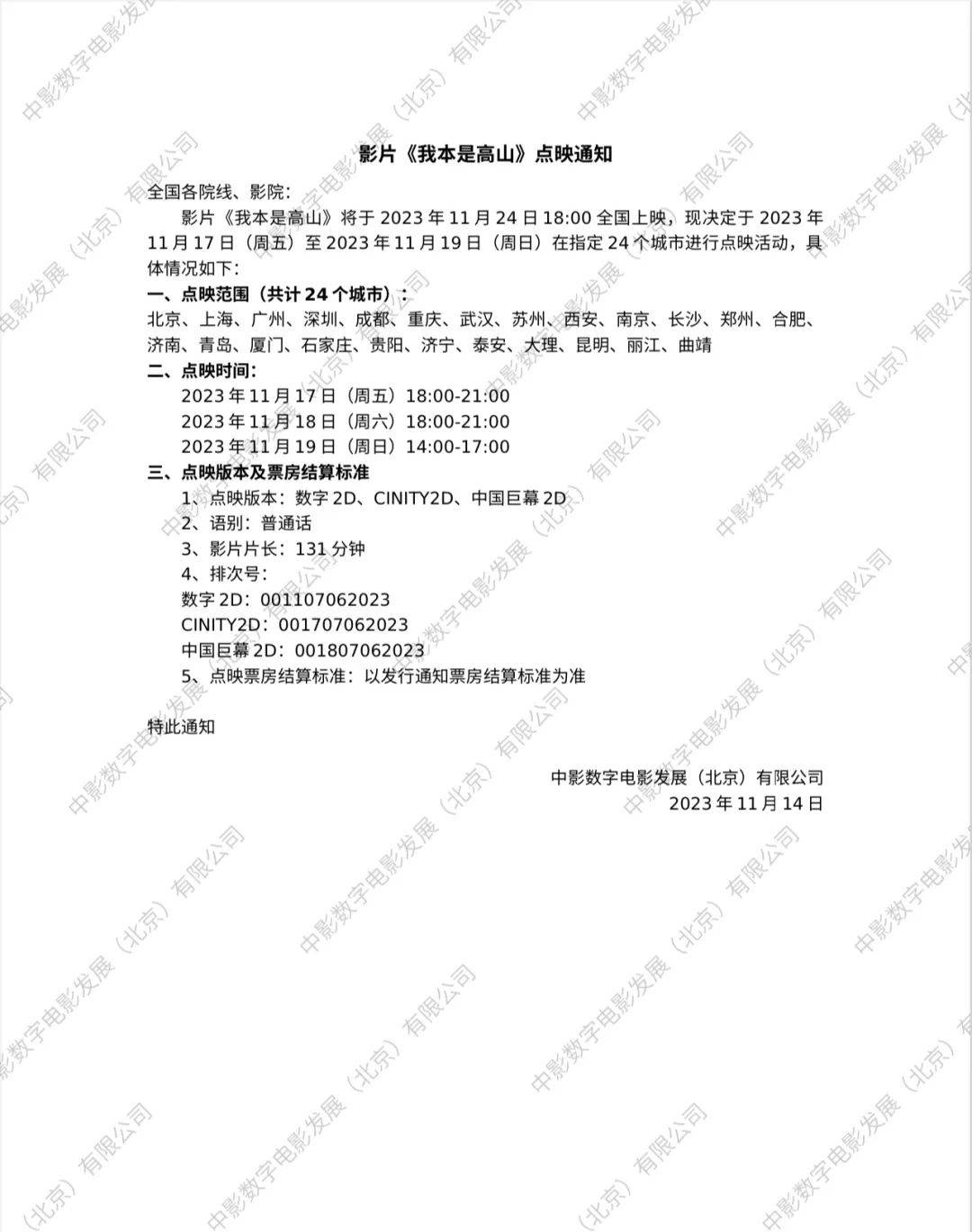 21日,红星新闻记者联系上《我本是高山》发行方一位工作人员,他表示,“那些影城开错场次了,所以今天才会统一沟通撤场。”据悉,此前,电影《我本是高山》官方微博曾发布影片11月18日-11月19日点映的消息,后续相关发行通知没有20日点映的消息。