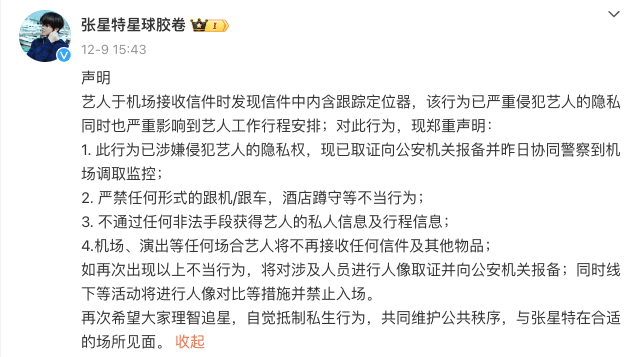 张星特在机场被私生饭泼水 网络视频截图 此前,12月9日,张星特工作室官方微博@张星特星球胶卷 曾发声明,抵制“私生(指行为极端、作风疯狂、侵犯明星私生活的粉丝)”行为。