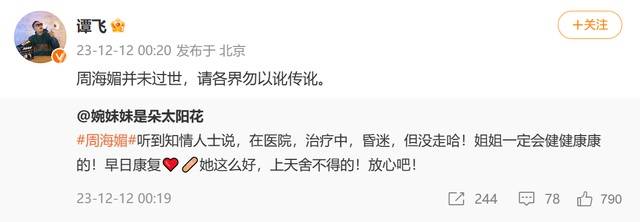 原标题:谭飞发文辟谣:周海媚并未过世 呼吁各界勿以讹传讹