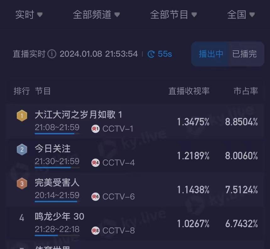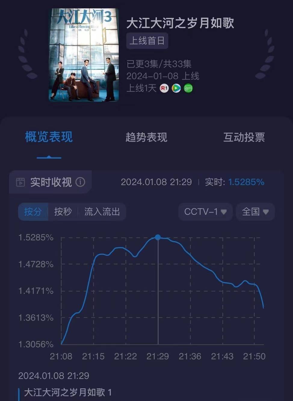从酷云的实时收视数据来看,《大江大河3》上线后收视率迅速突破1,收视率大幅提升,最高值超过1.52,夺得同期收视冠军。尽管晚上10:00出现了停播潮,但《大江大河3》的收视率依然成功维持在1.3左右,首播带来了令人满意的成绩。