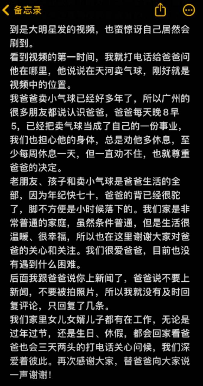 该视频火了后,11日晚,老人的女儿刷到视频后留言感谢:第一眼就认出爸爸,后来才看到是明星发的视频。透露快70岁的爸爸在广州卖气球多年,每天早五晚八,当成一份事业,劝不住就尊重他的决定。自己家条件普通但温暖幸福,过年过节休假都会回家看爸爸,三天两头也会打电话关心。