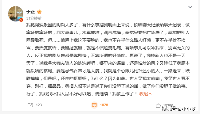 再看看于正的小作文,这不妥妥的怨妇言语吗?