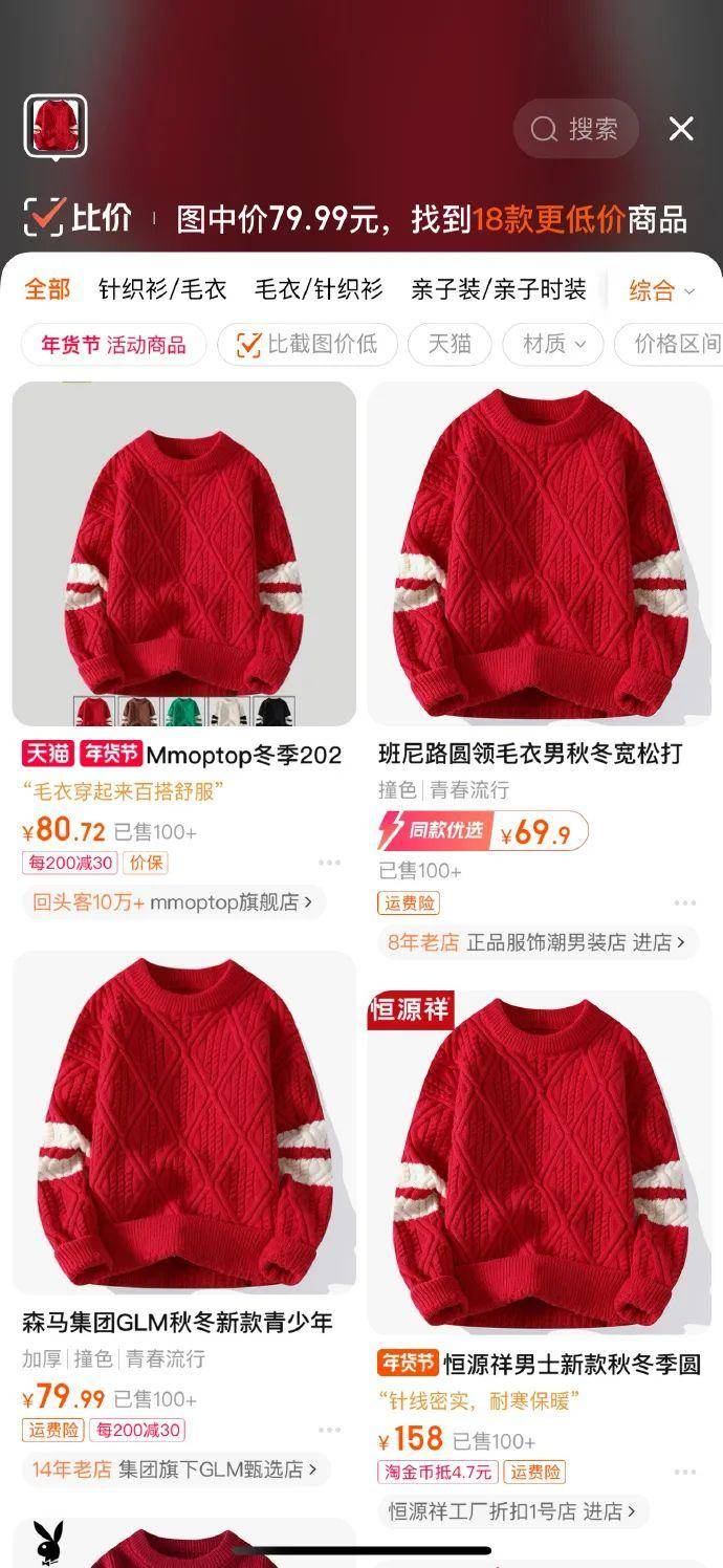 据报道,通过图片搜索,在电商平台上还有其他品牌也在售卖类似同款毛衣,最高价格为158元。