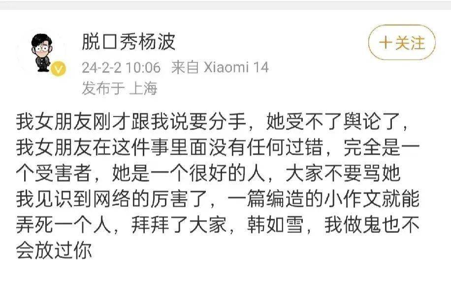 更离谱的是杨波还大爆粉丝隐私,公开女方姓名、学校、专业等信息,并指出女方存在精神问题,曾在微博发表不当言论,并被相关部门监视。