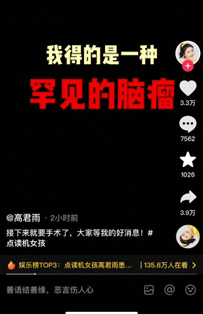 在2月29日的视频中,高君雨提到自己最终被诊断患有一种罕见脑瘤。视频中她疑似在医院病房,在微笑中剃掉头发,并提到自己接下来将要做手术。