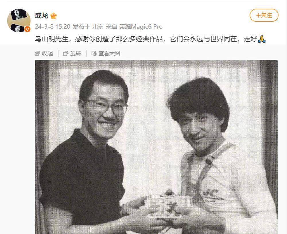 3月8日消息,日本知名漫画家鸟山明于3月1日因急性硬膜下血肿去世,终年68岁。鸟山明著有经典漫画作品《龙珠》《阿拉蕾》等。 据九派新闻报道,鸟山明生前很喜欢成龙,在访谈中多次直言没有《醉拳》就没有龙珠,还称自己看成龙的《醉拳》电影不下70次。根据公开消息,《龙珠》中悟空的性格设计中有成龙的影子,漫画龟仙人的名字“程龙”与成龙同音。
