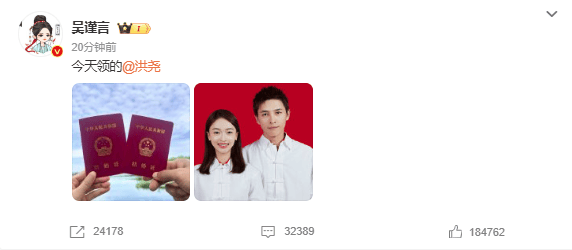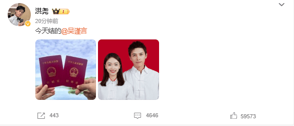 9月13日上午,吴谨言、洪尧分别发文,官宣领证!