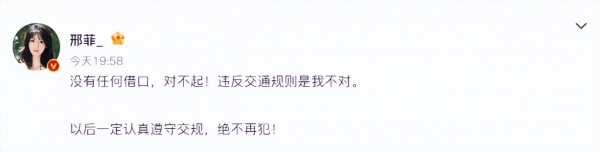 邢菲发文道歉,承认自己违反了交通规则,没有任何借口,是自己做得不对,并保证以后绝不再犯。这种大大方方认错,没毛病,开车还是要遵守交通规则,注意安全。