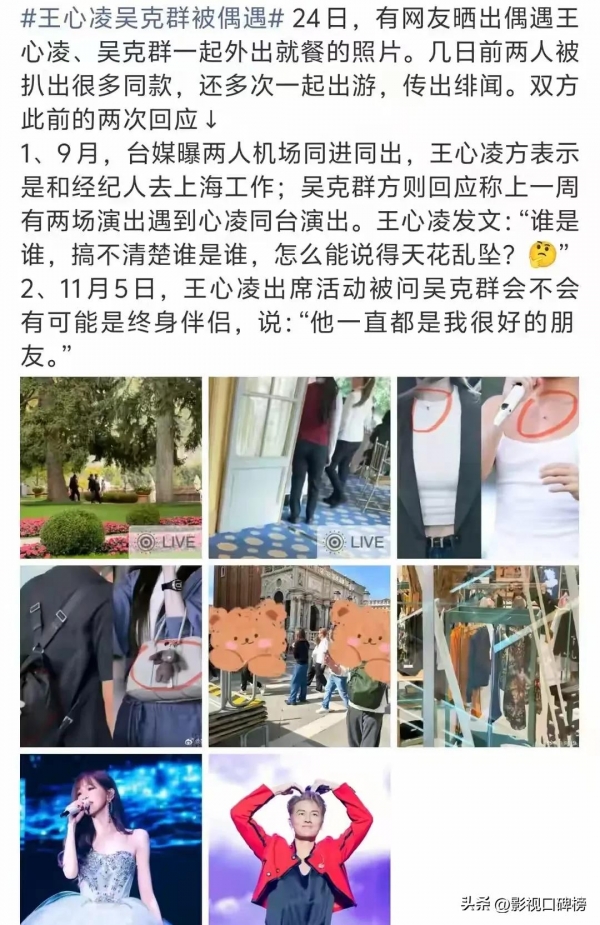 尤其是近日吴克群和王心凌在国外逛街旅游时被偶遇,画面中同行的还有双方的经纪人和助理,只是不同的是吴克群和王心凌走路时紧贴着,完全超出了朋友之间安全的社交范围。并且走路时低头交谈,显得亲密十足的样子。
