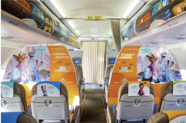 就连聚集了最多打工人的京沪航班也一扫班味儿,成了"痛机"。11月19日首映礼当天,东航的一趟航班专门换成了《疯狂动物城2》主题的涂装。机舱里,客座头巾上印着所有知名的角色,包括朱迪、尼克、豹警官、狸宝、闪电。小桌板上印着上海迪士尼动物城的地图。浦东机场T1航站楼的迪士尼商店旁,卫生间也悄然"变身",不止有小型动物专用洗手间,还为他们分隔出了专用电梯。