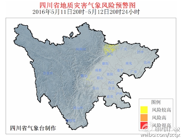 四川省气象台5月11日16时发布地质灾害气象风险预警:根据气象资料分析,2016年5月11日20时-5月12日20时24小时,广元、绵阳、雅安3市的部分地方发生地质灾害风险的可能性较大,请注意预防。