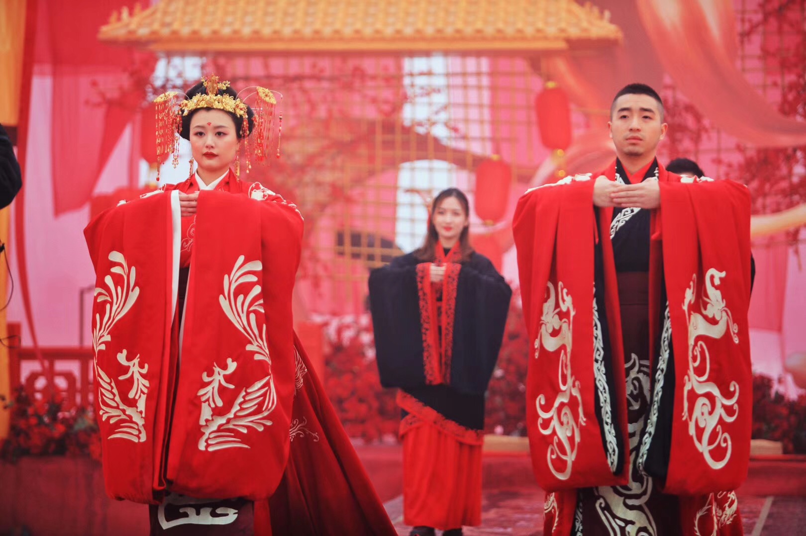 在以典雅、尊贵、庄敬为气韵的婚礼场地,99对新人虔诚的完成了行沃盥礼、行同牢礼、行合卺礼、行解缨结发礼、行执手礼等仪式,许下今生不变的誓言。