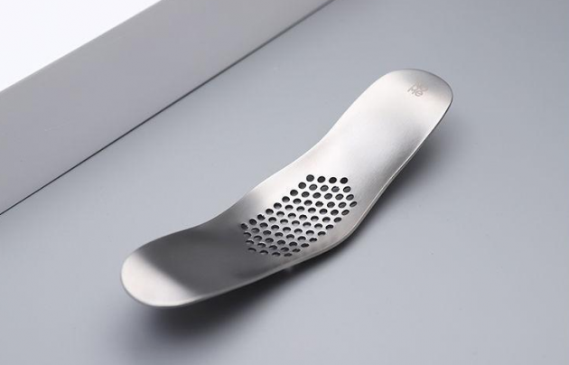 相信不少人都用过刀背拍蒜泥,那感觉真是又麻烦又累。幸好,我在NOME家找到了一款压蒜泥的神器,才将这件事情变得简单起来。它家这款压蒜器的设计看起来很简单,整个造型是一个浅浅的弧形,中间是密密麻麻的小孔。