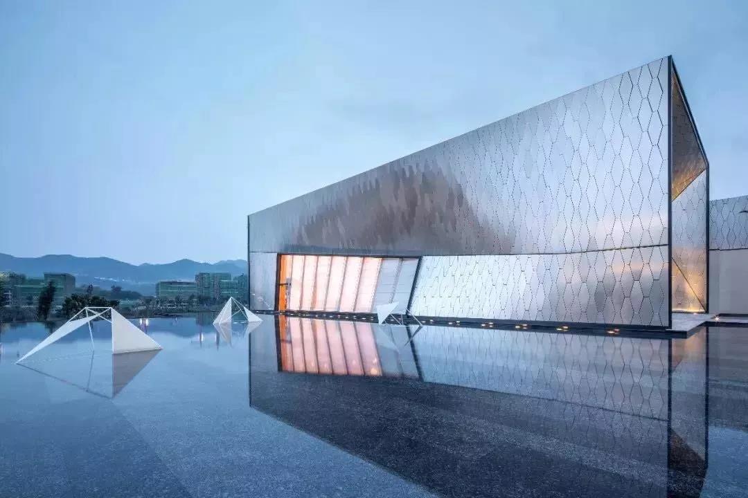 第二步映入眼帘的便是镜面浅水水景。整个水景体系外部以灰色石材作为边界的设计,让人的视觉体验逐步平静下来。通常运用在顶级酒店中的浅水造景手法,放置在进入社区后的第一个节点位置,同样也打破了传统社区的植被造景。每一个回家的人,如何真正意义上做到如释重负的轻快感,这是这面水景的价值所在。而在镜面水景边,偶然点缀的意大利定制艺术作品,在金属材质和光泽漆面的搭配下,与水景的柔和与边界的硬朗,形成了巧妙的融合与互动。