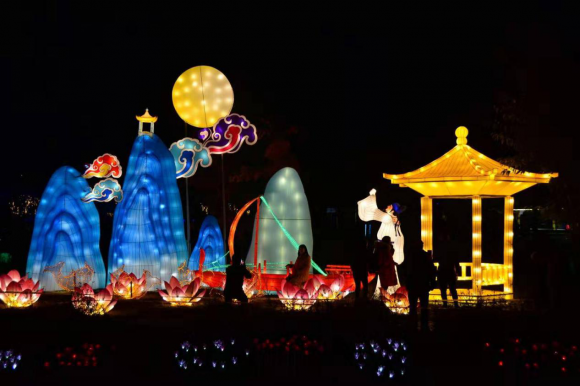 但西域美食的诱惑还只是本次德阳灯会的前奏,真正的重头戏在灯会启动仪式后才惊艳亮相。以“天上唐诗 人间宋词”为主题的2020年德阳灯会亮灯仪式于当天下午5点半正式开启,德阳市委市政府领导及中国和海相关负责人分别表达了对本届德阳灯会的期待,对市民游客表示了新春的祝福。伴随着新疆和田文工团的精彩演绎,晚上18点18分,灯会正式启动,中国和海园区内所有灯组全面亮灯,和海银滩也在科技感十足的激光秀中瞬间化身为繁星点点的宇宙星河。