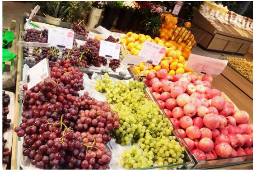 一进门店,首先映入眼帘的便是新鲜的水果,进口的紫红色车厘子与亮红色的草莓摆放在醒目位置,让人一看就口水直流。我家孩子最喜欢这两种水果,忍不住让我先买一袋给他尝鲜。