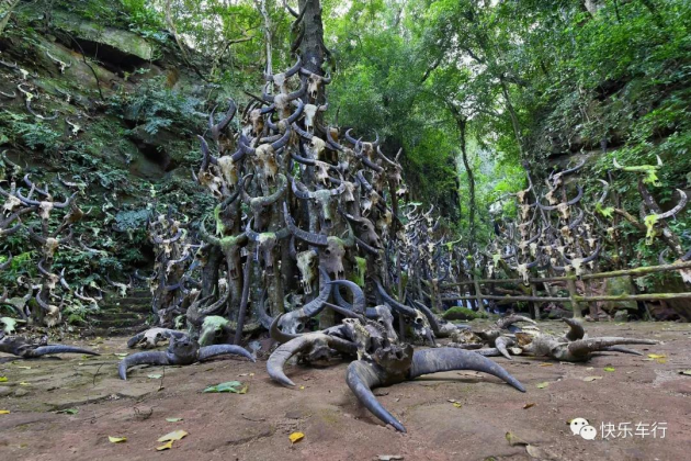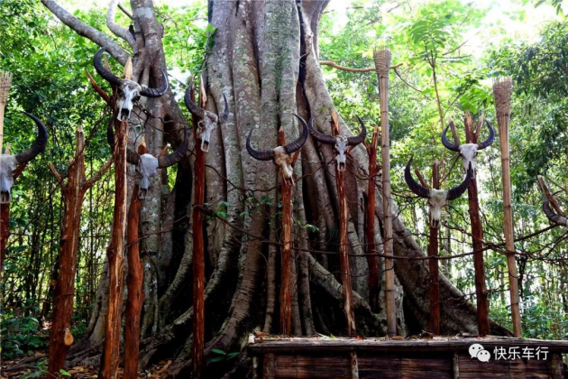 雨林里常年云雾缭绕,幽深的谷底树梢和悬崖峭壁上悬挂着无数水牛头骨、就连饱受岁月沧桑的“人头桩”至今存在。