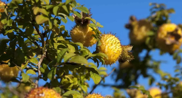 刺梨又名茨梨、九头鸟、缫丝花等。广泛分布于我国亚热带地区的四川、贵州、湖南等地。刺梨具有喜温喜湿的特点,抗涝耐旱力强,根系发达,固土作用好,对土壤的适应性较大。刺梨具有很高的营养价值、药用价值和观赏价值。果实富含糖、维生素、胡萝卜素、有机酸和20多种氨基酸、10余种对人体有益的微量元素,富含超氧化物歧化酶(SOD),SOD是国际公认具有抗衰老、防癌作用的活性物质,还具有抗病毒、抗辐射的作用,在心血管、消化系统和各种肿瘤疾病防治方面应用十分广泛。刺梨中维生素C、P和SOD含量居所有蔬菜水果之冠,其维生素C含量为2500mg/g鲜果,是橙子的50倍,猕猴桃的12倍,SOD含量为10000u/g鲜果,具有“维生素C之王”的美称。可做成果脯、果茶、干果食用。