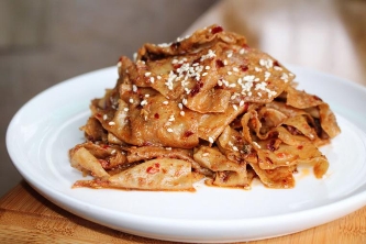 锅里留少量的金龙鱼食用油,加入蒜末、小米椒炒香,入花椒、辣椒末、花椒粉、椒盐、孜然粉等料小火慢慢炒香。倒入炸好的豆腐皮翻炒,加入适量的细盐、白糖、酵母鲜回味粉、酵母鲜回香粉,炒制均匀入味。最后出锅,撒上炒好的白芝麻。