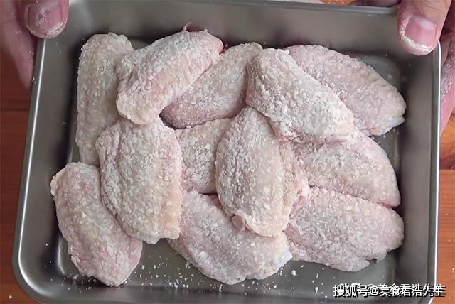 2、之后取出鸡翅,再打掉上面多余的面粉,备用。