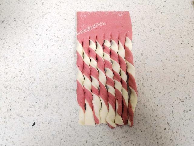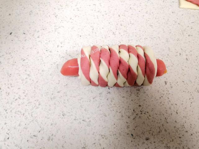 12所有的香肠都卷好,我把两种颜色的面皮的边角料揉在一起成粉色面皮做了一个粉色的香肠卷。