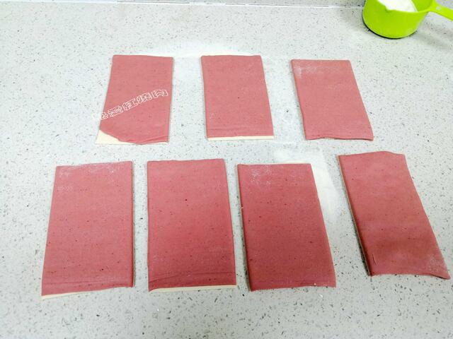 7把红面皮放在白色面皮上,放之前先在白面皮上刷一层清水,这样两个面皮结合的会更紧密,放好以后切成小的长方形,注意长方形的宽要比你准备的小香肠稍微窄一点点。