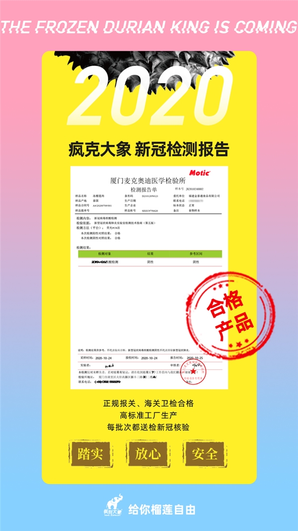 在全球疫情的大环境下,疯克大象在食品安全上也是做了很大努力的,它积极响应和配合支持国家卫健委疫情防控工作,进口的每个批次的榴莲都做了新冠检测,产地溯源码一目了然,海关卫检也合格,货源稳定又很安全。产品的包装也是可循环利用的环保材质,开盒即可食用,支持微波炉加热方便快捷。让人很放心的还有它的售后服务,一旦遇到产品问题秒处理。