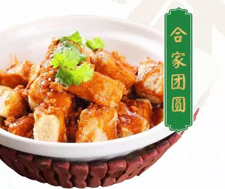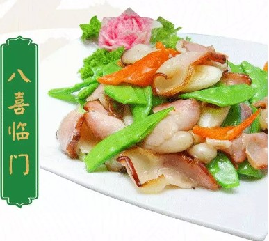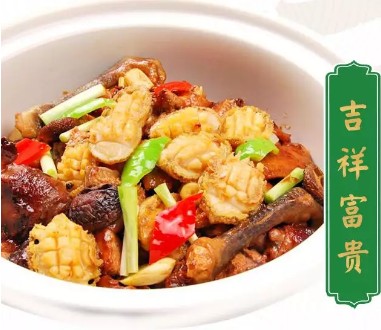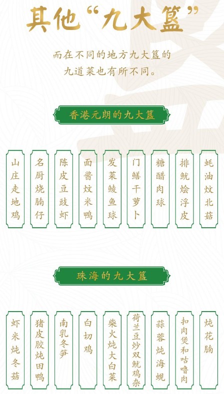 传统的“"九大簋” 中的粤菜菜品,如脆皮鸡、脆皮脚猪、澳门烧肉、咕姥肉等等