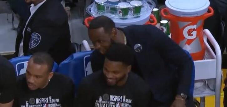 格林被驱逐离场之后,镜头给到场边看球的詹皇,只见他躲在小弟身后偷着乐,也不知道说了什么话,仙丹笑得这么开心,不过再次直面镜头,詹皇表情大变,一脸淡定继续看球,哈哈,三旬老汉太有趣了。