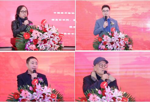 协办单位荣宝斋副总经理唐辉致辞(左上),收藏天下总裁董文星致辞(右上),北京国艺美术馆馆长王清杰致辞(左下),张松先生致答谢辞(右下)。