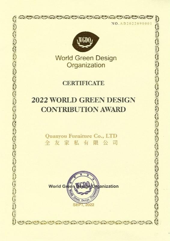 “绿色设计国际贡献奖”是世界绿色设计论坛设立的国际性、公益性奖项,旨在表彰以绿色设计为手段,以绿色技术、绿色材料、绿色能源、绿色服务为媒介,对改善人类生存环境做出卓越贡献的专业人士和专业组织。全友凭借多年的技术积累和创新经验,持续推出引领国际潮流的绿色产品,打造了从绿色材料到绿色设计、从绿色制造到绿色物流、从绿色营销到绿色服务的“全流程绿色供应链”,并积极倡导绿色环保理念,热心公益和环保事业,向社会与公众传达着绿色关爱的社会正能量。