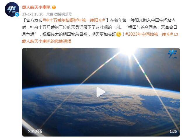 官方发布!神舟十五号航天员乘组拍摄新年第一缕阳光