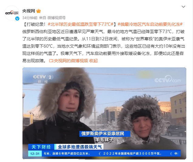 【打破纪录!#北半球历史最低温跌至零下73℃#】#俄最冷地区汽车启动前要先化冻# 俄罗斯西伯利亚地区近日遭遇罕见严寒天气,最冷的地方气温已经降至零下73℃,打破了北半球的历史最低气温纪录。从11日到12日夜间,被称为“世界寒极”的奥伊米亚康气温达到零下60℃,当地水文气象和环境监测部门表示,这些地区已经有大约10年没有出现这样低的气温了。极寒天气下,汽车启动前要用外接取暖设备化冻,即便如此还是容易出现故障。@央视网选