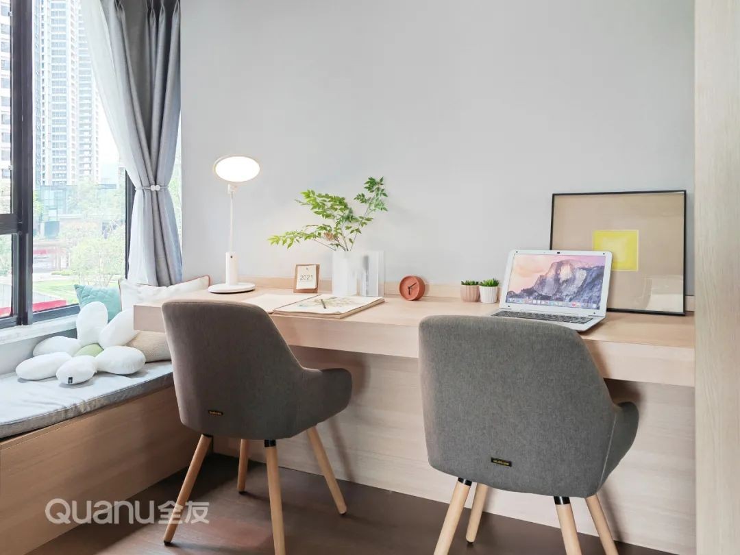 儿童房衣柜采用浅灰与粉紫搭配,低饱和色系让整体氛围显温柔。侧边开放格可以挂放书包,床头留空则可以辅助床头柜随手置物。06 书房