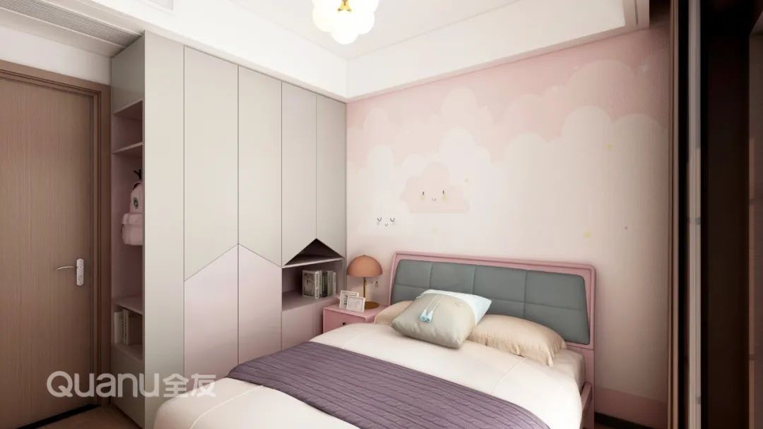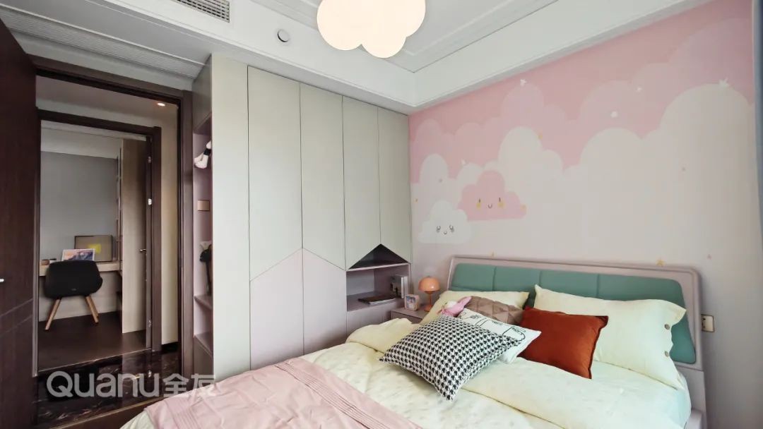 根据户主需求,设计师将次卧作为客房,采用了榻榻米+衣柜一体式设计,能够充分利用空间进行储物。衣柜的开放格还可以摆放艺术装饰品,提升视觉美感。05 儿童房