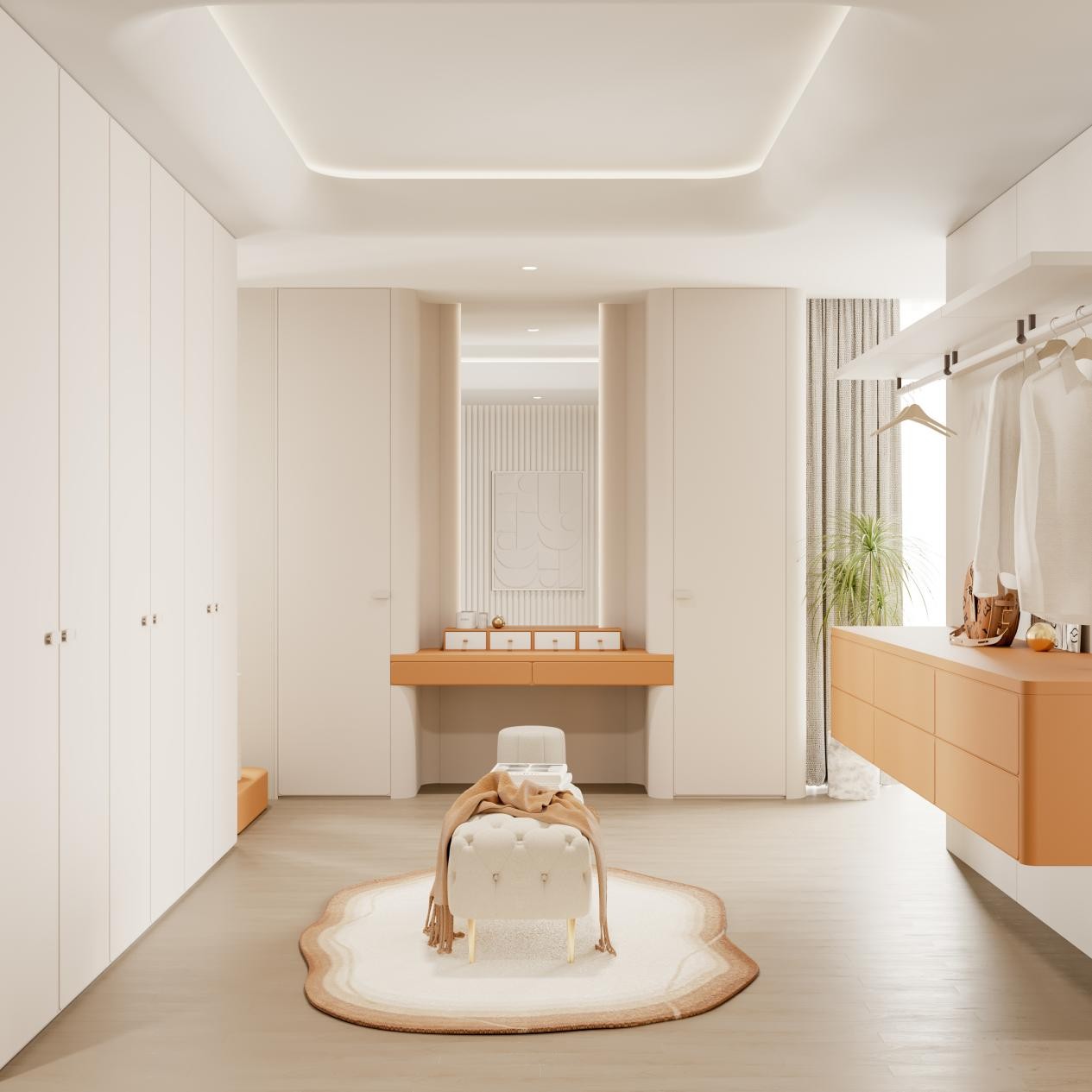 衣帽间采用了常规衣柜和墙挂式衣柜的组合式设计,常穿衣物随手挂区,其它衣物有序整理,可以满足绝大部分消费者的收纳需求;再搭配桌柜一体化妆区,到顶梳妆镜+柔光灯带照亮美颜时刻,轻松打造出功能多样且分明的衣帽间区域。
