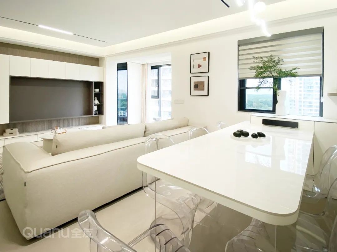 整墙餐边柜中部留空,转角处延展出半柜,水杯、小家电等物品皆可置放于此。亚力克餐桌桌腿+餐椅中和了空间直线条的冰冷感,光影流转中,带来轻盈灵动的视觉感受。