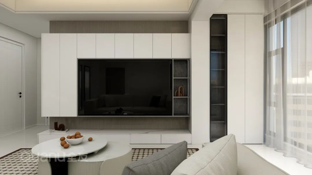 电视墙定制悬空柜+一字落地柜,搭配栅格板,立体感十足。阳台定制顶天立地式收纳柜,储物量大,实用美观。