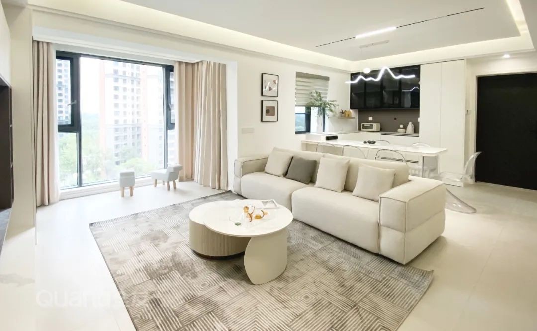 由于客厅面积较小,设计师选择将阳台纳入室内,增加采光和活动空间,搭配落地窗带来开阔视野,客厅更显通透明亮。
