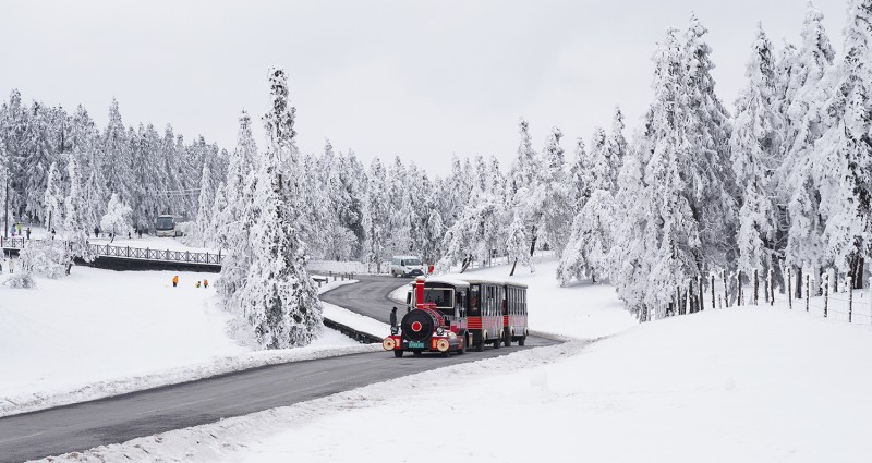 冬季出游仙女山,乘坐小火车观赏冰雪世界必不可少。坐着欧式小火车穿行于白色世界中,在高低起伏的最美公路,看着无边际的雪景向远方延绵,最后消失在尽头。道路两旁不时有悠闲的牛马出来寻觅吃的,共同形成一幅惬意画面。