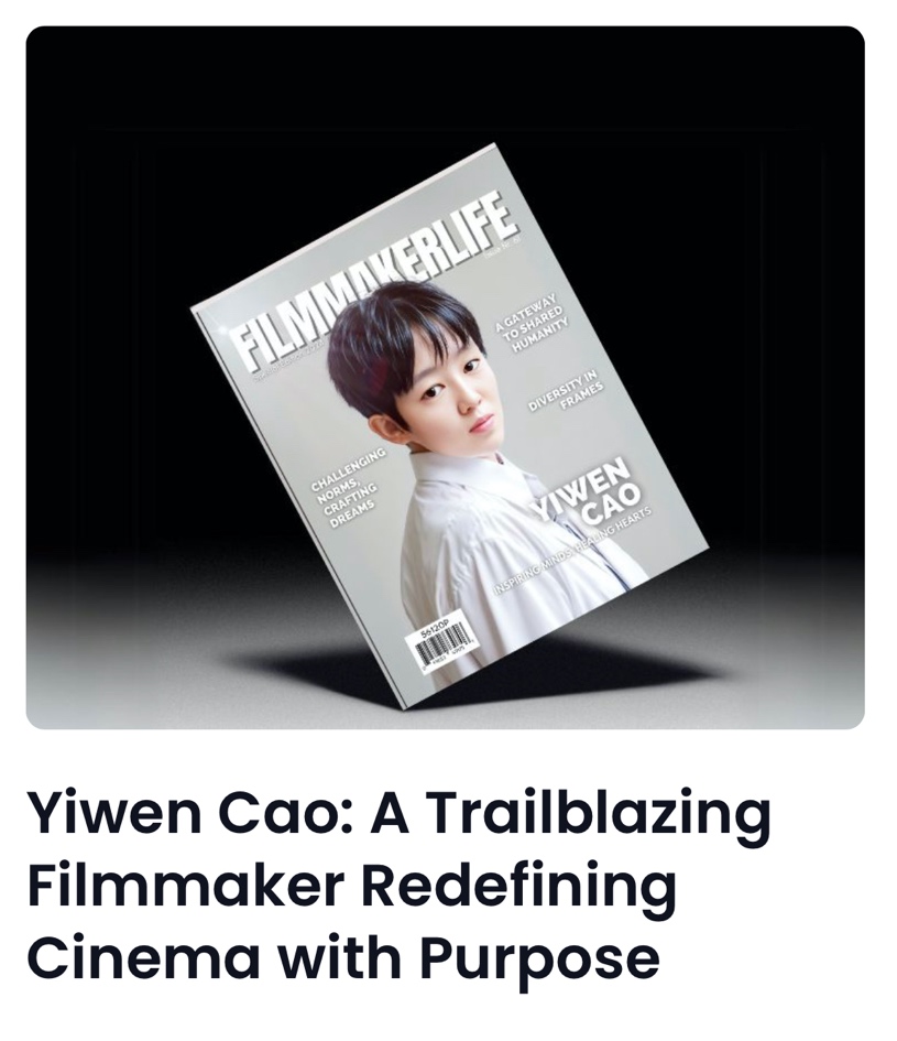 2024年2月9日,法国先锋电影杂志Filmmaker Life特意选在农历中国新年,用大篇幅对我国青年女性电影人曹译文进行了专题报道,并使用时下最新的AI技术将其制作成了封面。在杂志中,记者盛赞曹译文是“重新定义电影的先驱”(“A Trailblazing Filmmaker Redefining Cinema with Purpose”),并称其是一颗冉冉升起的明星(“A rising star”)。